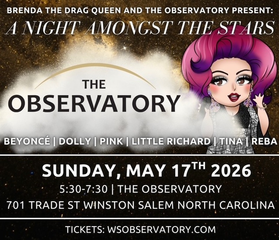 Join Brenda The Drag Queen as she brings the very best in drag celebrity illusions to Winston’s new, out-of-this-world, craft cocktail destination. Plan to attend this VIP meet-and-greet in advance of Brenda’s new show at Camel City Playhouse, right next door to The Observatory, taking place at 8pm. Tickets available at camelcityplayhouse.com. Tickets for both the show and cocktail experience are limited, so don’t wait!